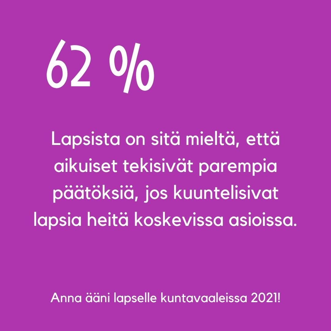 Anna ääni lapselle -kuntavaalikampanjassa julkaisemme kaiken kaikkiaan viisi vaikuttamispakettia tammi–kesäkuun 2021 aikana. Pakettien teemat ovat lapsiperheköyhyys ja eriarvoisuus, lasten ja nuorten osallisuus, koulu ja varhaiskasvatus, lapsimyönteinen päätöksenteko sekä aika vaikuttaa.