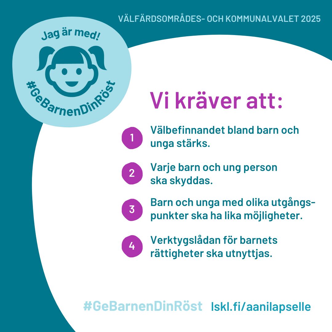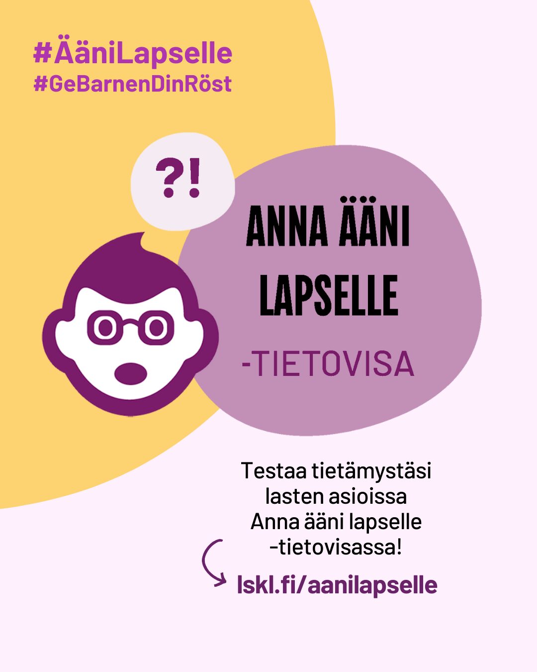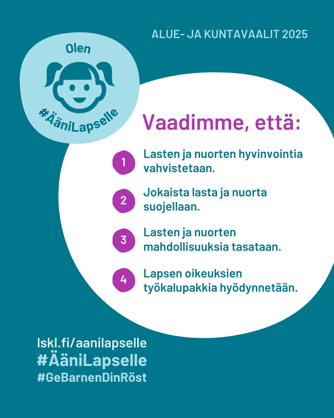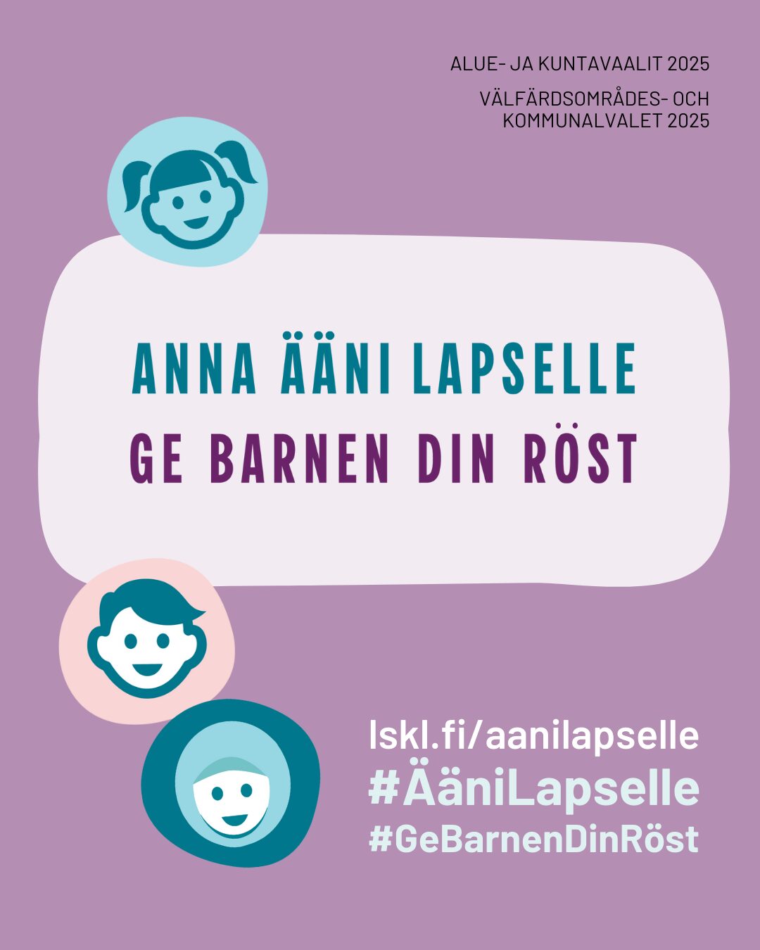 Anna ääni lapselle -kampanja pyrkii varmistamaan, että kuntien ja hyvinvointialueiden tulevilla päättäjillä on riittävästi tietoa, keinoja ja esimerkkejä tavoista, joilla lasten ja nuorten tulevaisuudesta ja tästä päivästä voidaan huolehtia. Se tarjoaa myös äänestäjille tietoa ja tapoja vaikuttaa lasten ja nuorten puolesta.