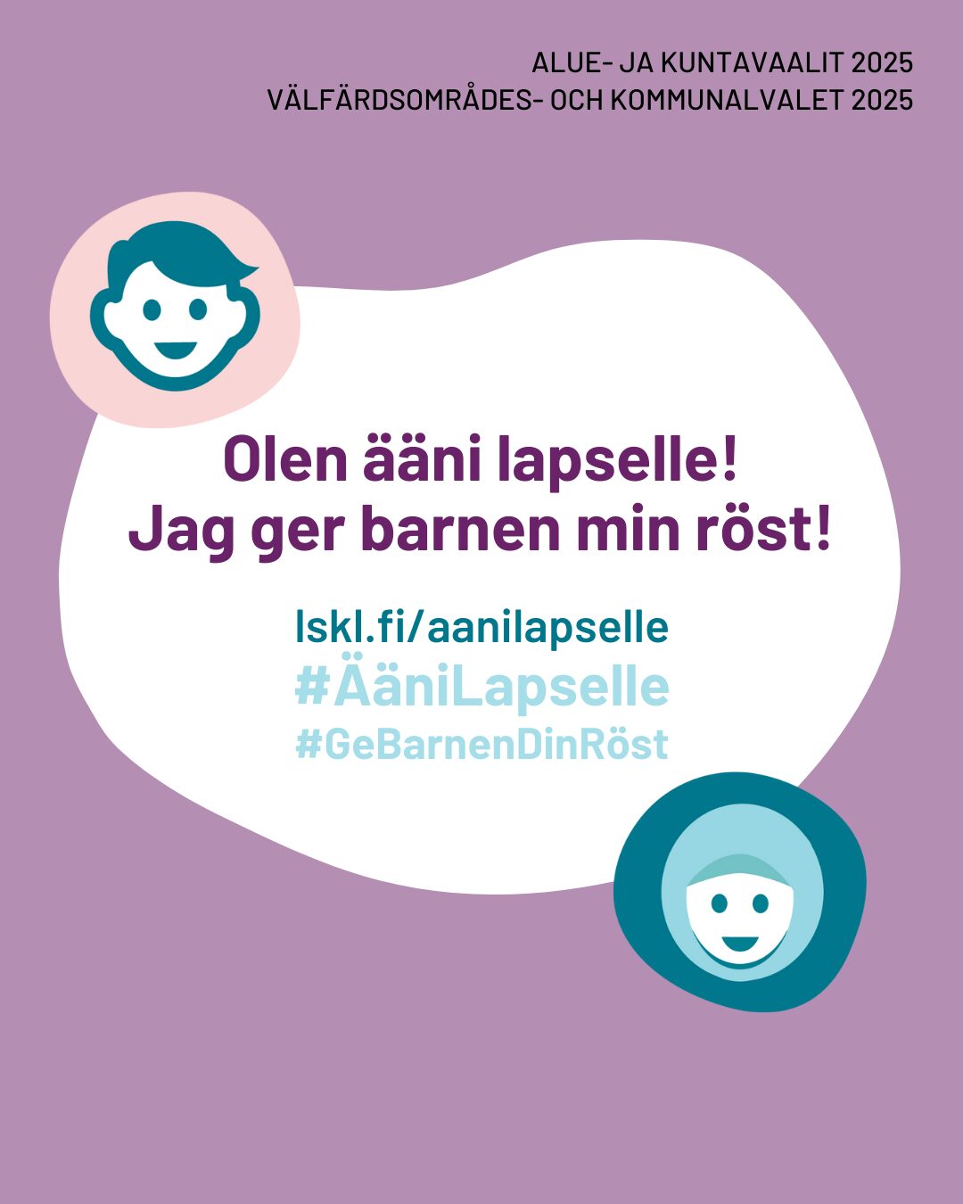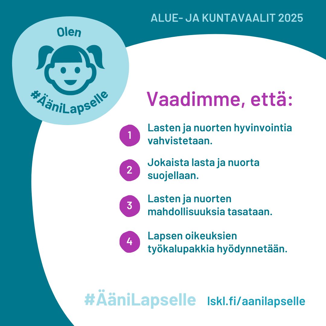 Tältä sivulta saat käyttöösi kaikki alue- ja kuntavaalien Anna ääni lapselle −vaikuttamismateriaalit, kuten Ääni lapselle -infokirjeet, somekuvia ja infograafeja. Kaikki materiaalit ovat vapaasti käytettävissä. Anna ääni lapselle -alue- ja kuntavaalikampanjassa julkaisimme kaiken kaikkiaan neljä vaikuttamispakettia tammi–huhtikuun 2025 aikana. Löydät sivulta myös somekuvia valtuutetuille ja vapaaehtoisille.